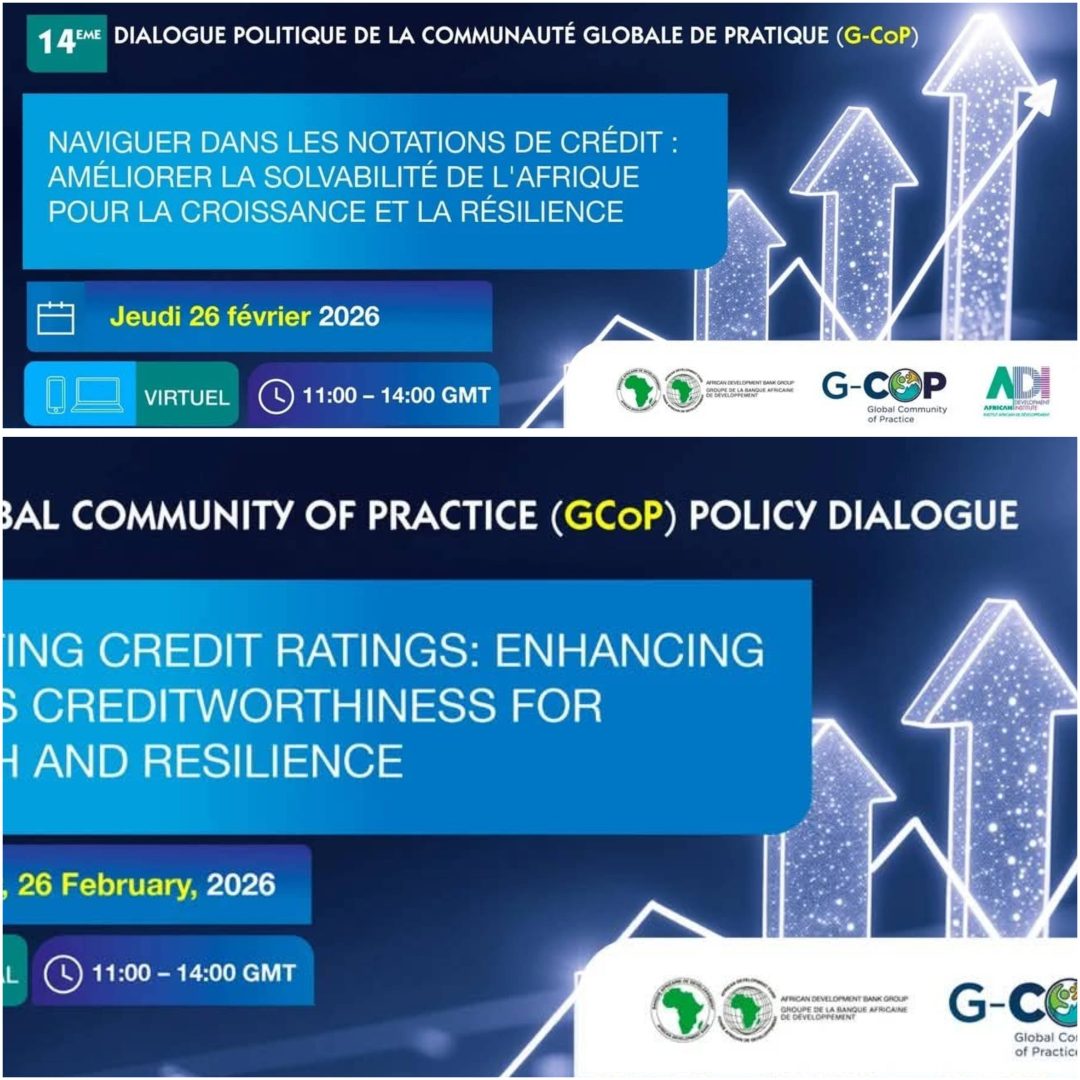 EN CE MOMENT. Le 14ᵉ Dialogue politique de la Global Community of Practice (G-CoP) se tient en format virtuel autour d’un thème stratégique pour l’avenir économique du continent : « Naviguer dans les notations de crédit : renforcer la solvabilité de l’Afrique pour soutenir la croissance et la résilience ».